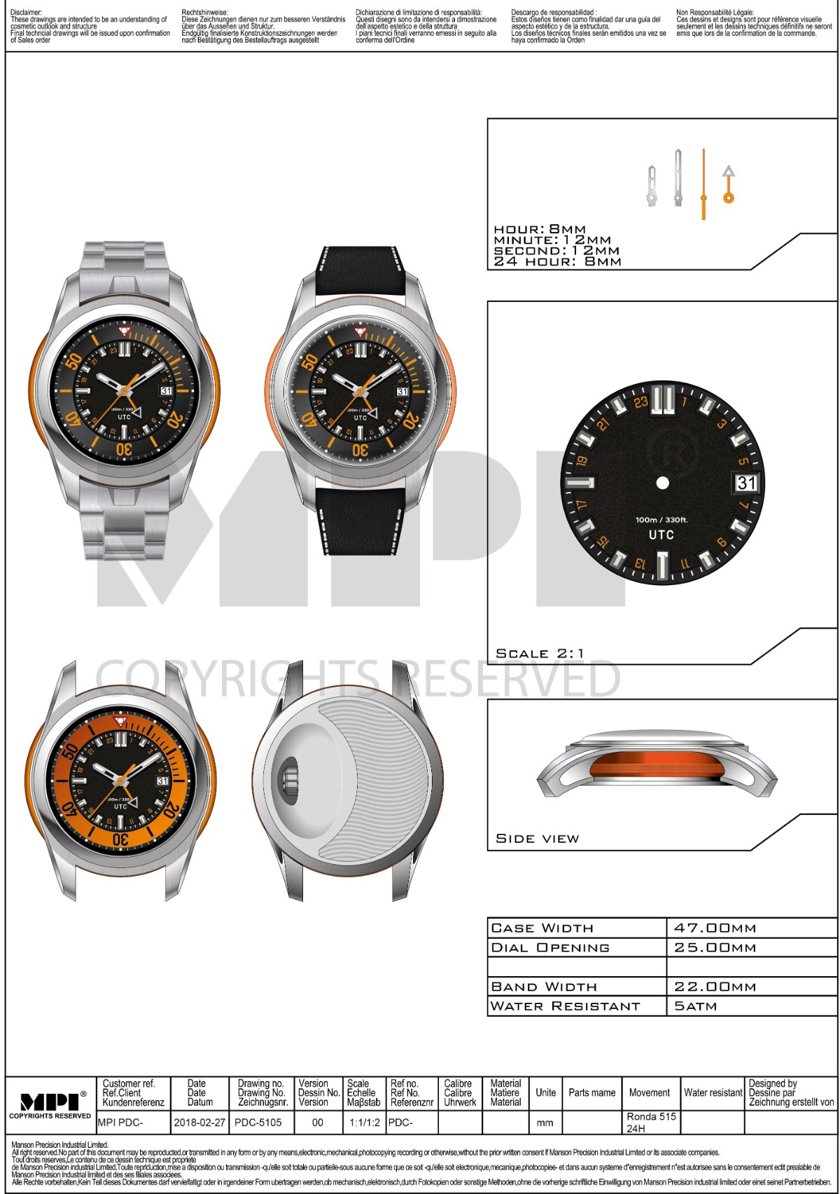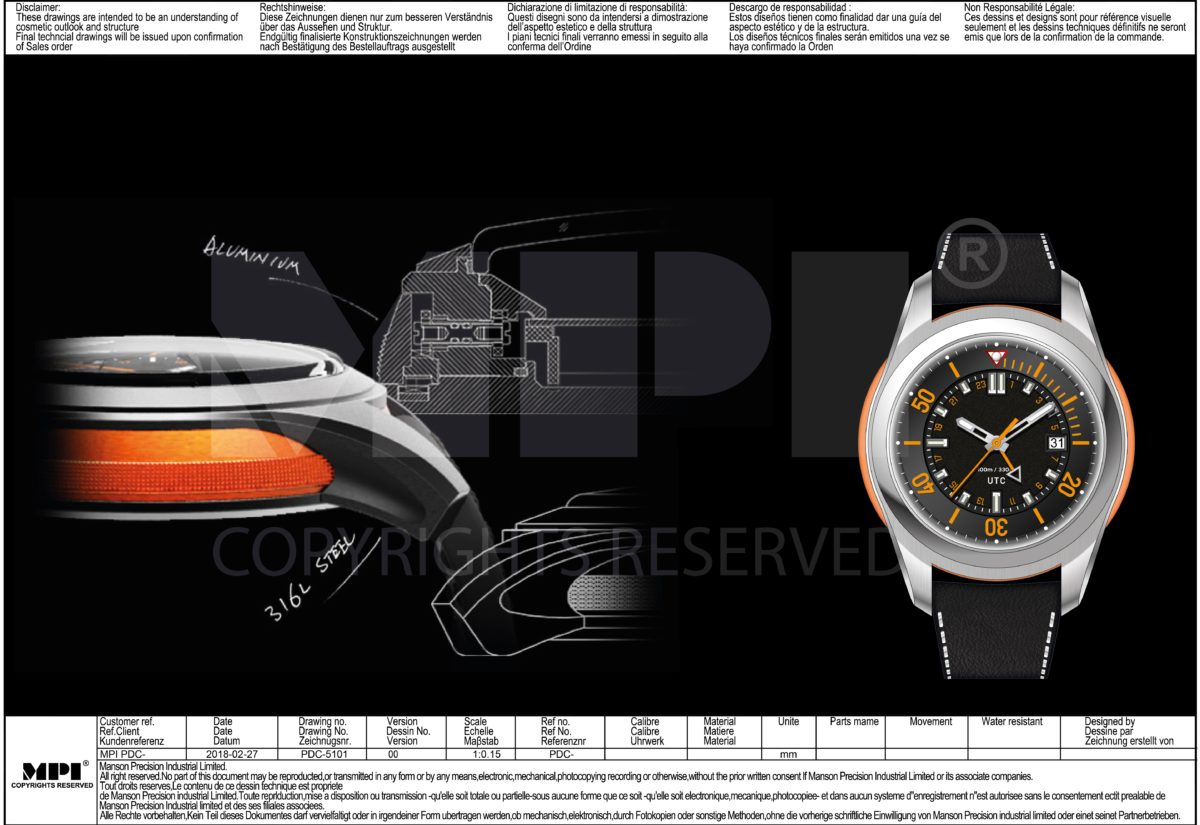 For Swiss assembly, we offer a Certificate of Origin issued by the Swiss Chamber of Commerce and the “Swiss Made” logo stamped on each timepiece.